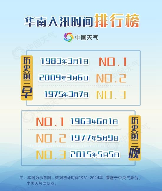 中国天气网统计了1961年至2024年的大数据发现,今年华南前汛期开启时间虽偏晚,但还不算最晚的。历史上,1963年华南前汛期开启时间最晚,6月1日才姗姗来迟;1983年最早,在3月1日就早早到来。