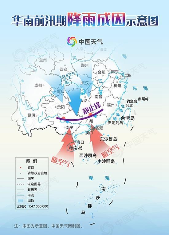 这与这四个省份所处的地理位置有关,华南前汛期频繁降雨的主要成因是冷暖空气的交汇,冷空气翻越南岭与北上的暖湿气流相遇,产生锋面降雨。广东正处于冷暖空气交汇的活跃地带,因此容易出现降雨,往往率先入汛。