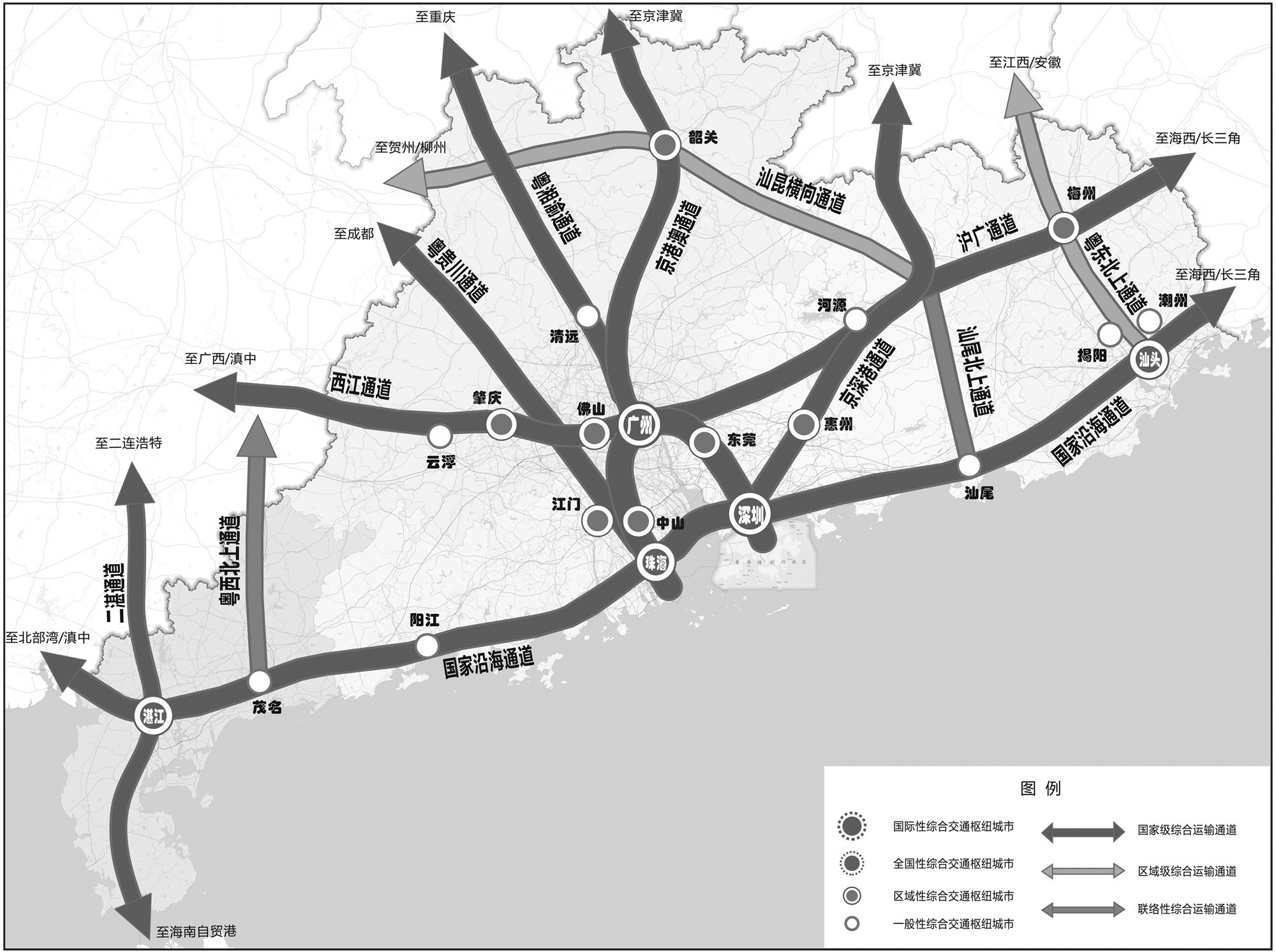 广东省综合立体交通网主骨架及枢纽城市布局示意图 图片来源:《广东省综合立体交通网规划纲要》